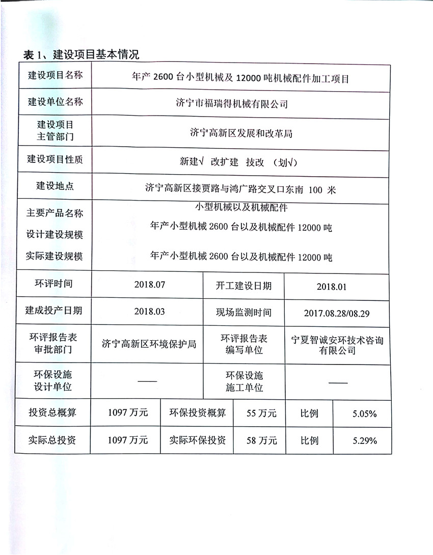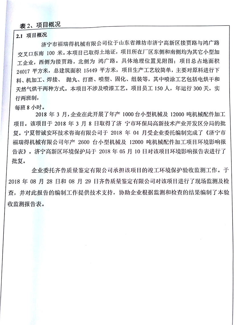 濟(jì)寧市福瑞得機(jī)械有限公司年產(chǎn)2600臺小型機(jī)械及12000噸機(jī)械配件加工項目(廢氣、廢水)竣