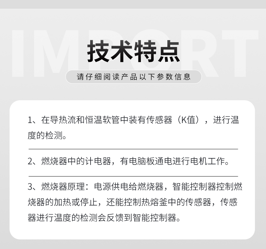 燃燒器原理:電源供電給燃燒器,智能控制器控制燃燒器的加熱或停止,還能控制熱熔釜中的傳感器,傳感器進(jìn)行溫度的檢測(cè)會(huì)反饋到智能控制器。