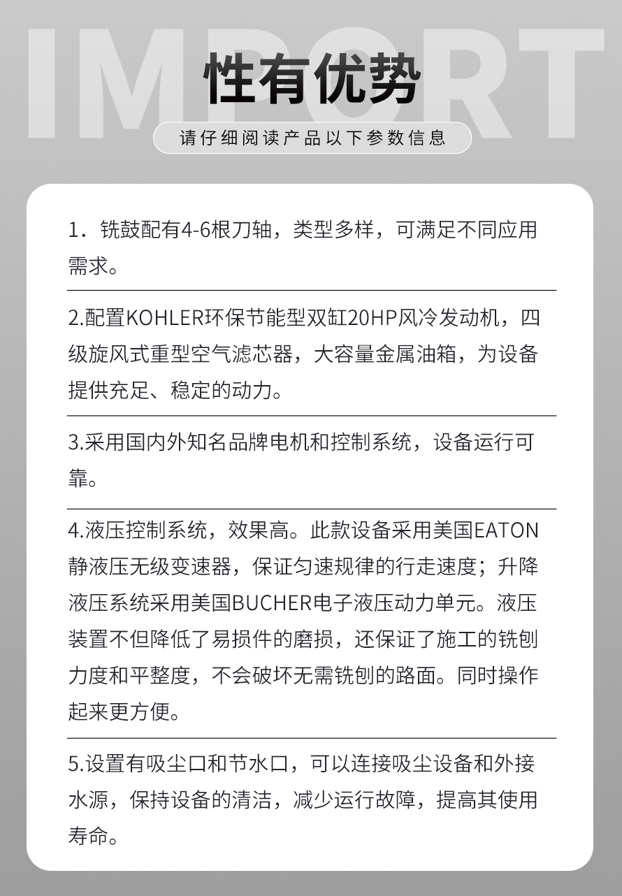 液壓銑刨機(jī)結(jié)構(gòu)緊湊,布局合理,具有控制精度高、性能穩(wěn)定、操作簡(jiǎn)單、維護(hù)保養(yǎng)方便等優(yōu)勢(shì)。其適合各種強(qiáng)度較高的混凝土瀝青等高出部分的去除工作,是其它類型的銑刨機(jī)無法替代的產(chǎn)品。